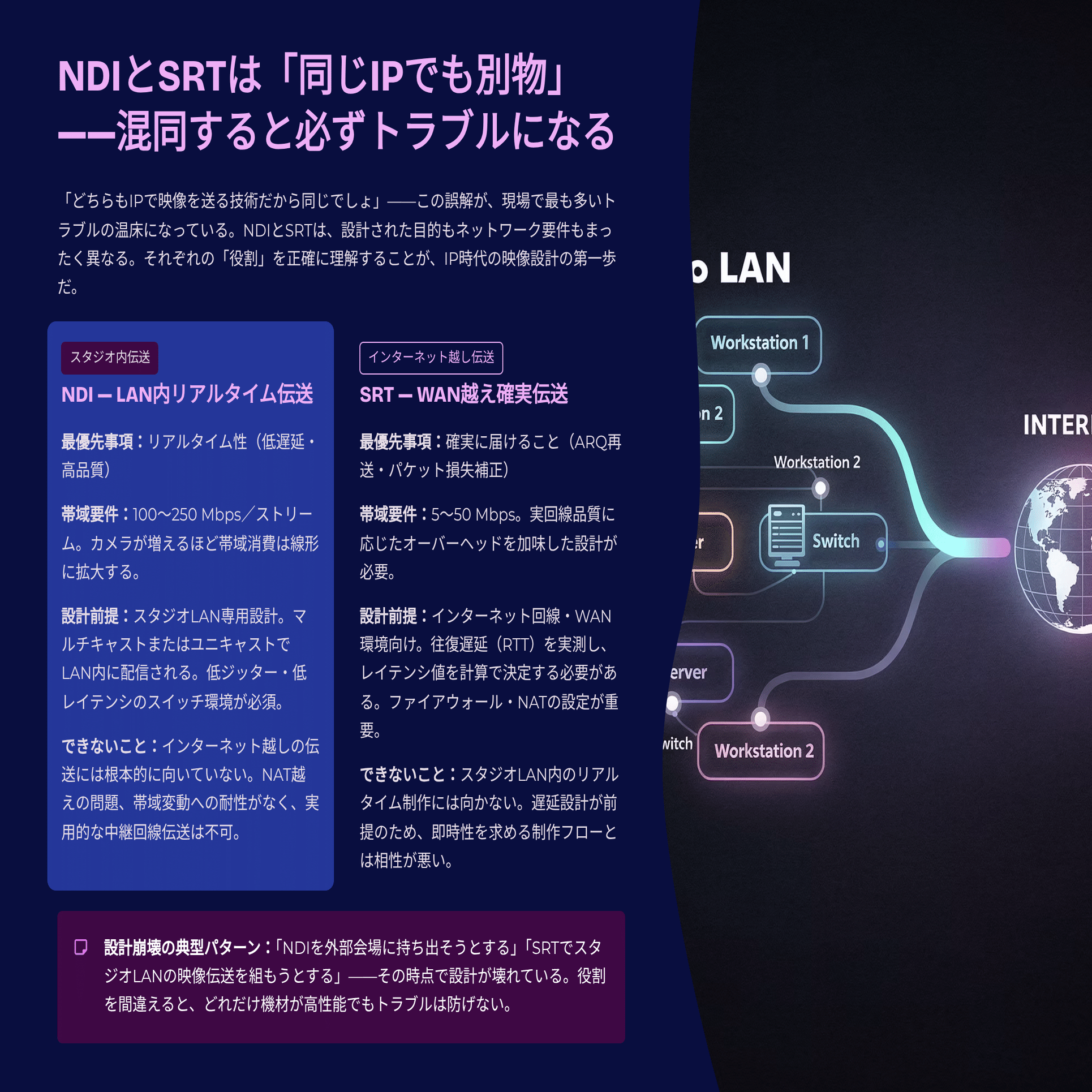 現場でIP映像を扱うとき、混乱の原因の一つが「NDIとSRTを同じものだと思い込む」ことだ。