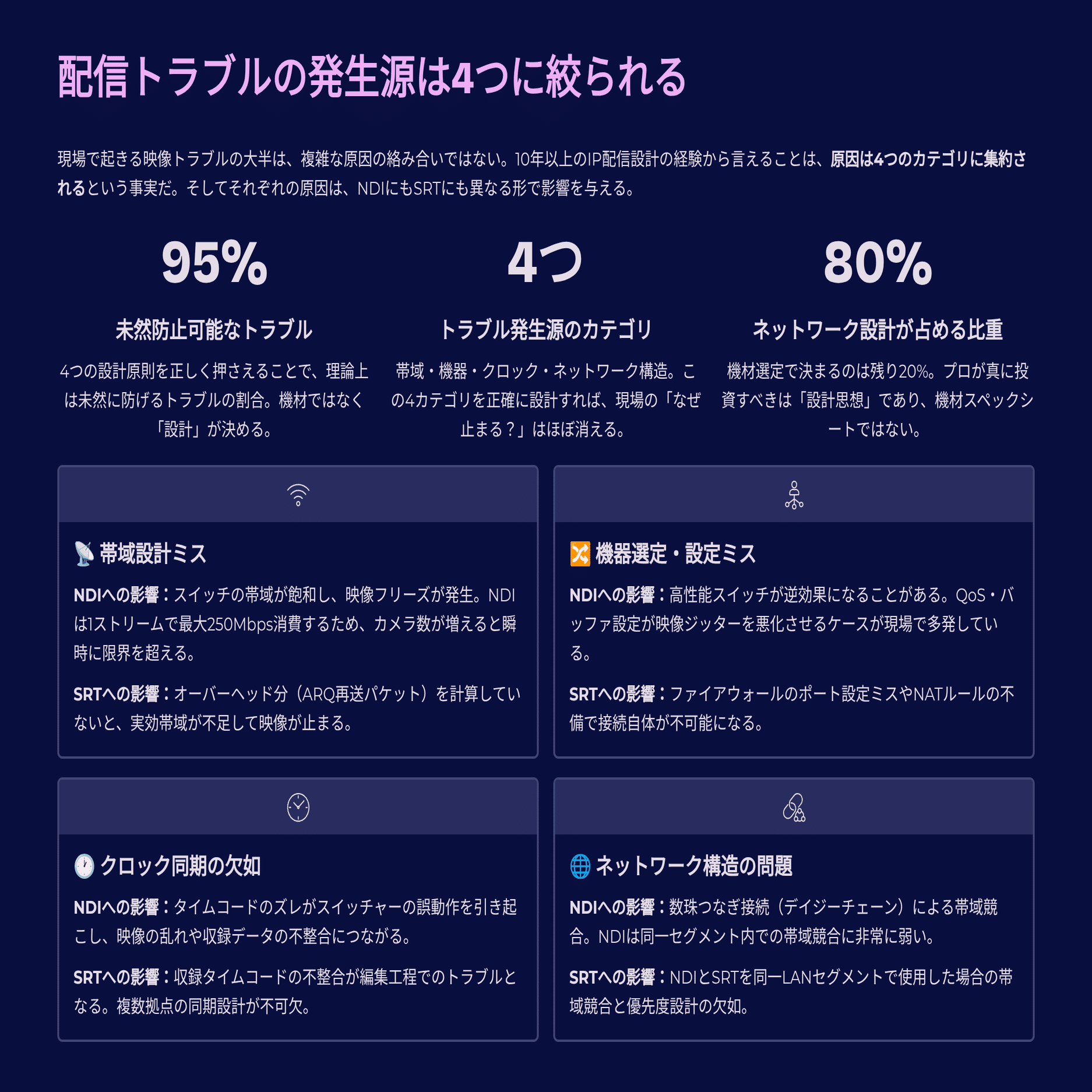 映像が止まるトラブルの発生源は、大きく4つの領域に分かれる。帯域の設計ミス、ネットワーク機器の選定・設定ミス、クロック(時刻)同期の欠如、ネットワーク構造の問題だ。