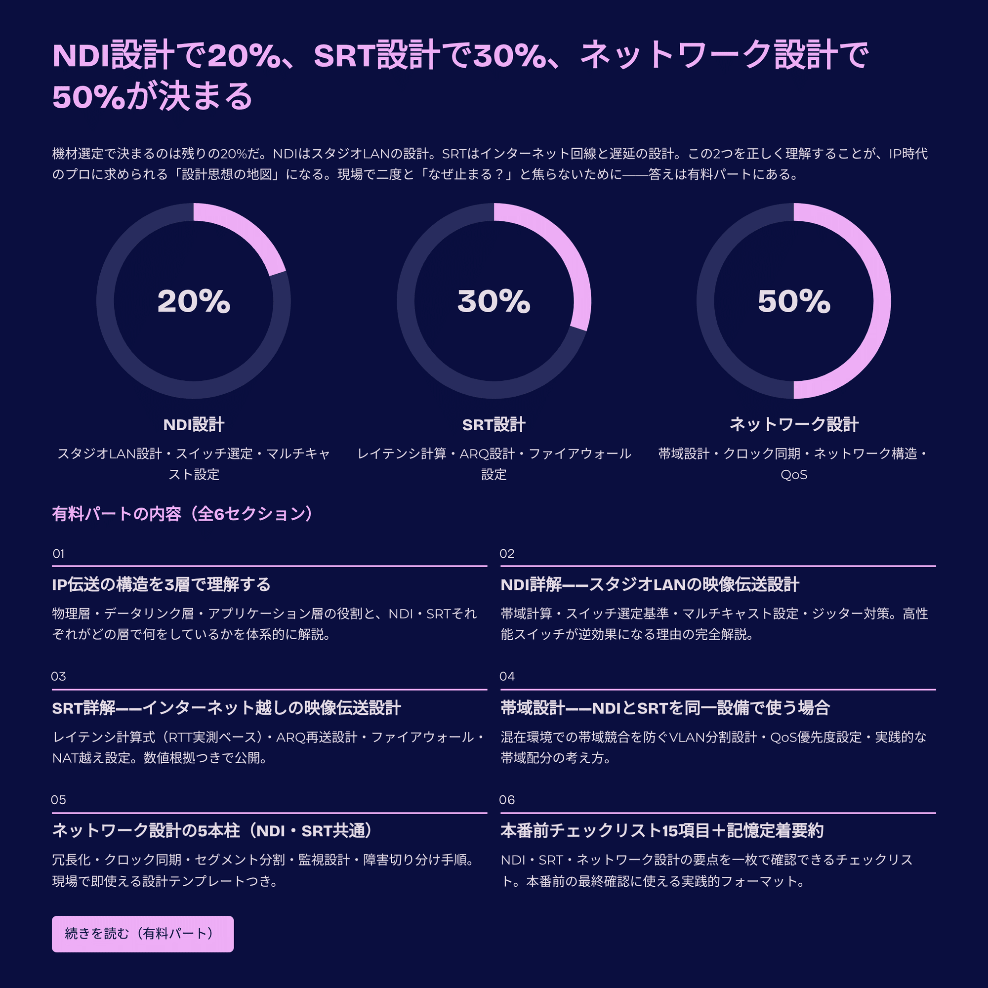 IP伝送の3層構造、NDI専用の帯域設計と同期対策、SRTのレイテンシ計算とモード選択、NDIとSRTを混在させるハイブリッド設計、ネットワーク設計の5本柱、そして本番前のチェックリストと記憶定着のための要約まで、現場でそのまま使えるレベルで書いている。