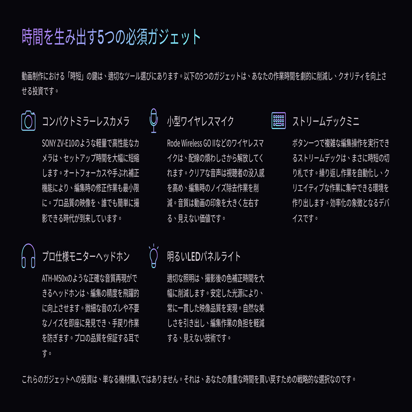 その鍵となるのが、私自身が実践し、「人生を変えた」と断言できる5つのガジェットと、その具体的な活用法です。