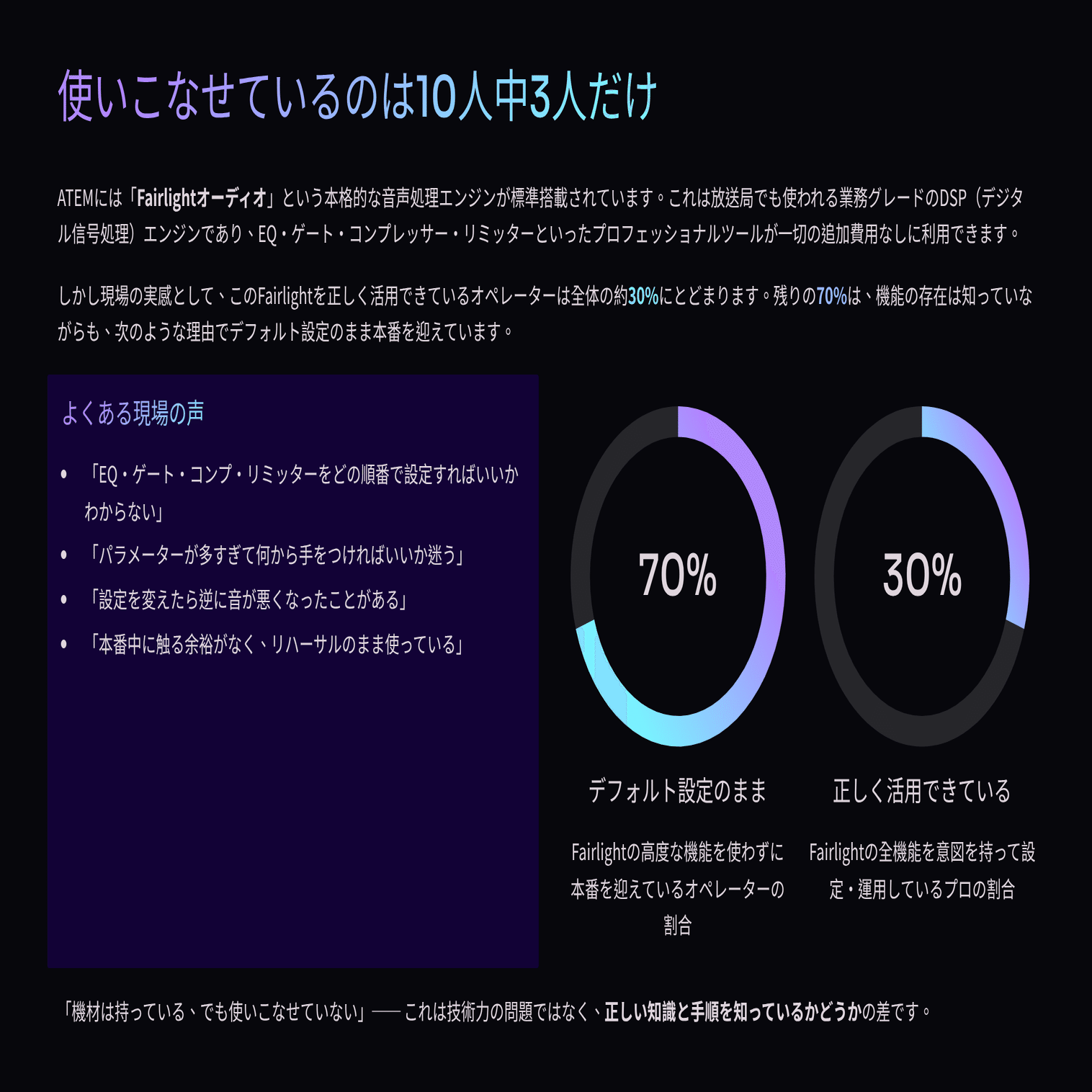 ところが、このFairlightオーディオを使いこなせているオペレーターは、現場感覚で10人中3人程度しかいない。残り7割は、機能の存在は知っていても「何をどの順番で設定すればいいか」がわからず、デフォルト設定のまま本番を迎えている。