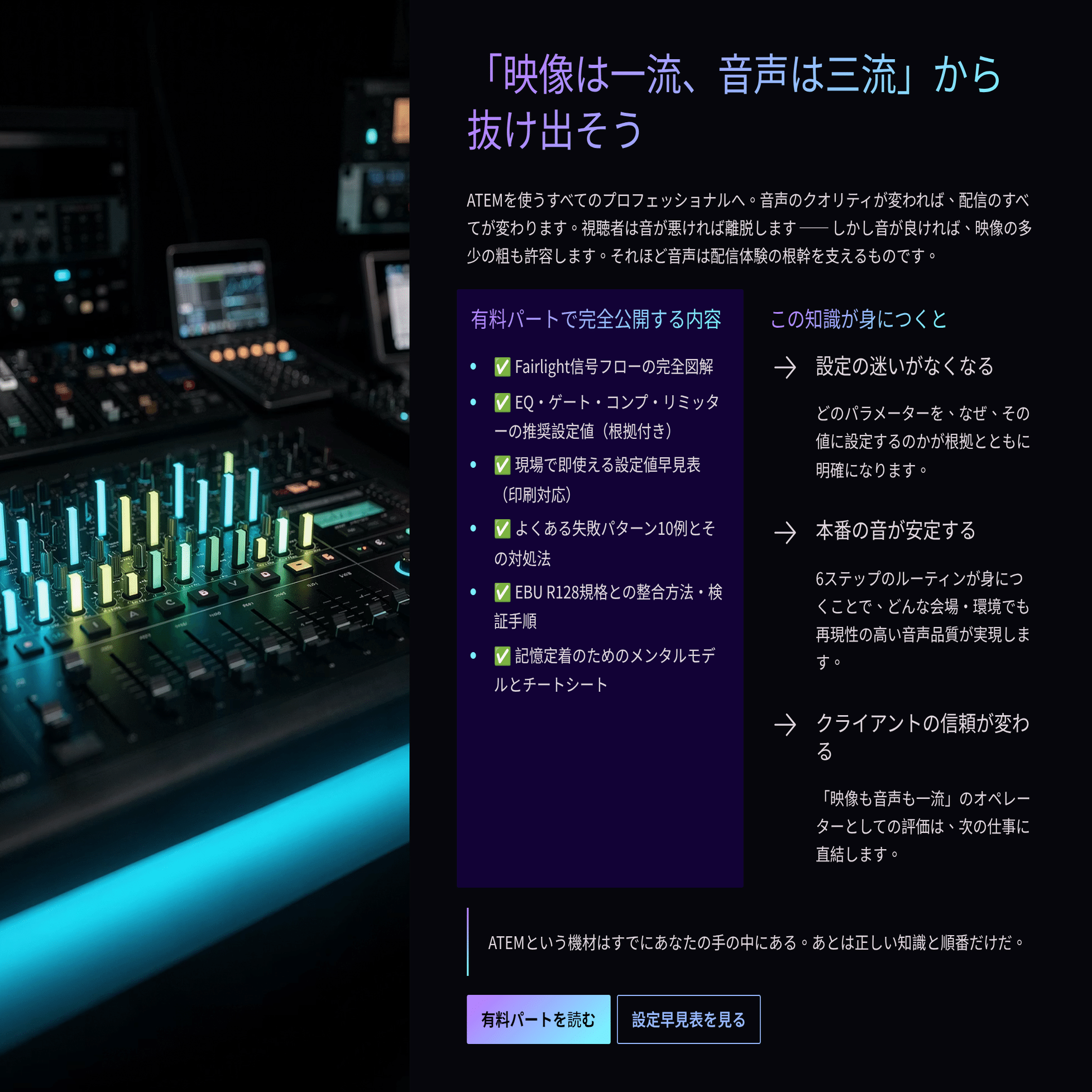 この記事では、各ツールが「何をするものなのか」という基本的な理解から始まり、現場で即使える具体的な数値設定と、プロが身につけるべきワークフローを完全公開する。有料部分では、設定値の根拠となる放送規格(EBU R128)との関係、各パラメーターの意味、そして「なぜその数値なのか」の理由まで丁寧に解説している。