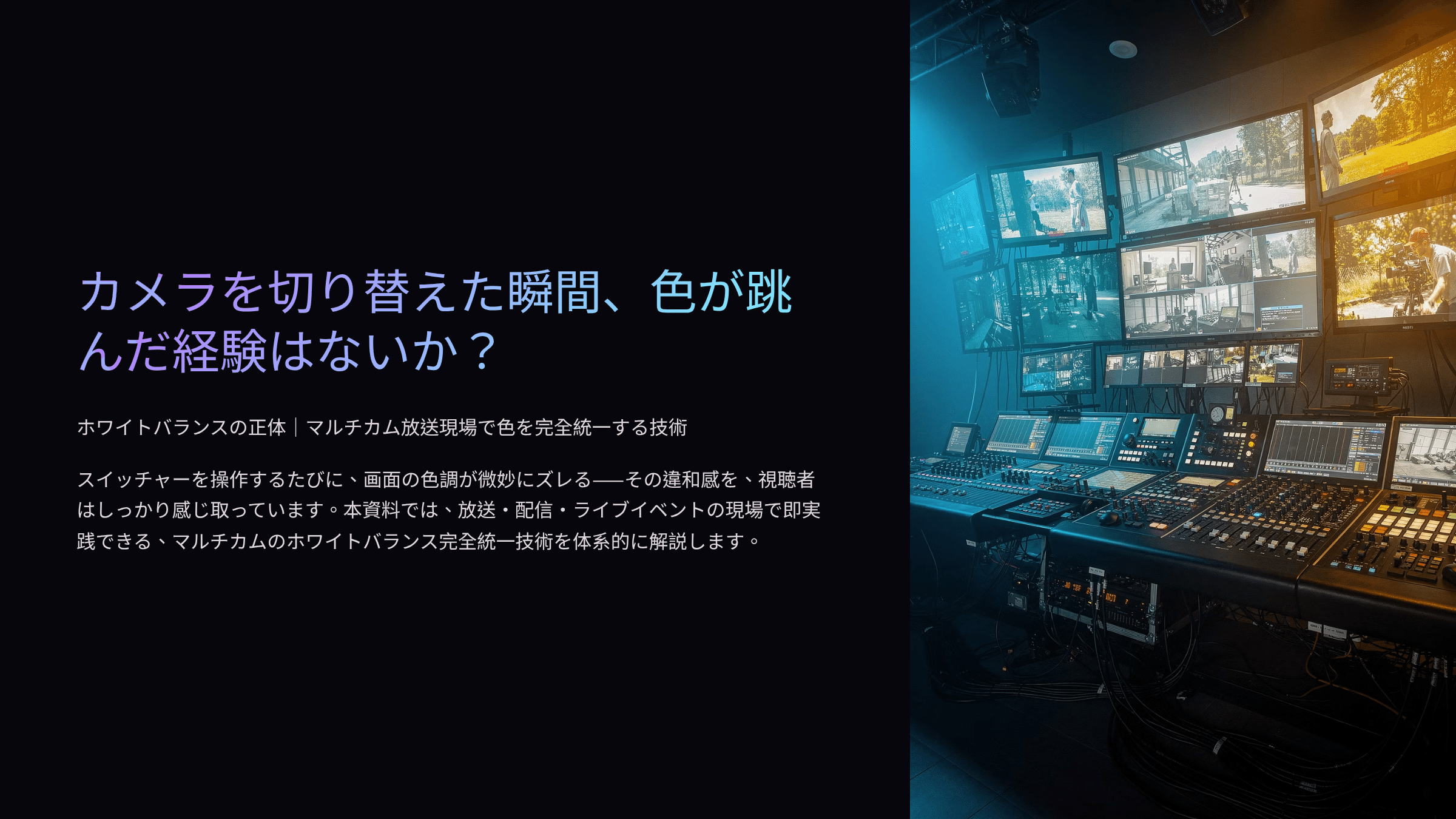 スタジオ撮影と放送・配信現場のWB運用は、根本的に思想が異なる。スタジオでは「正確な再現性」が正義だ。しかし配信・中継の現場では、カメラを切り替えるたびに色の基準が動いていては破綻する。