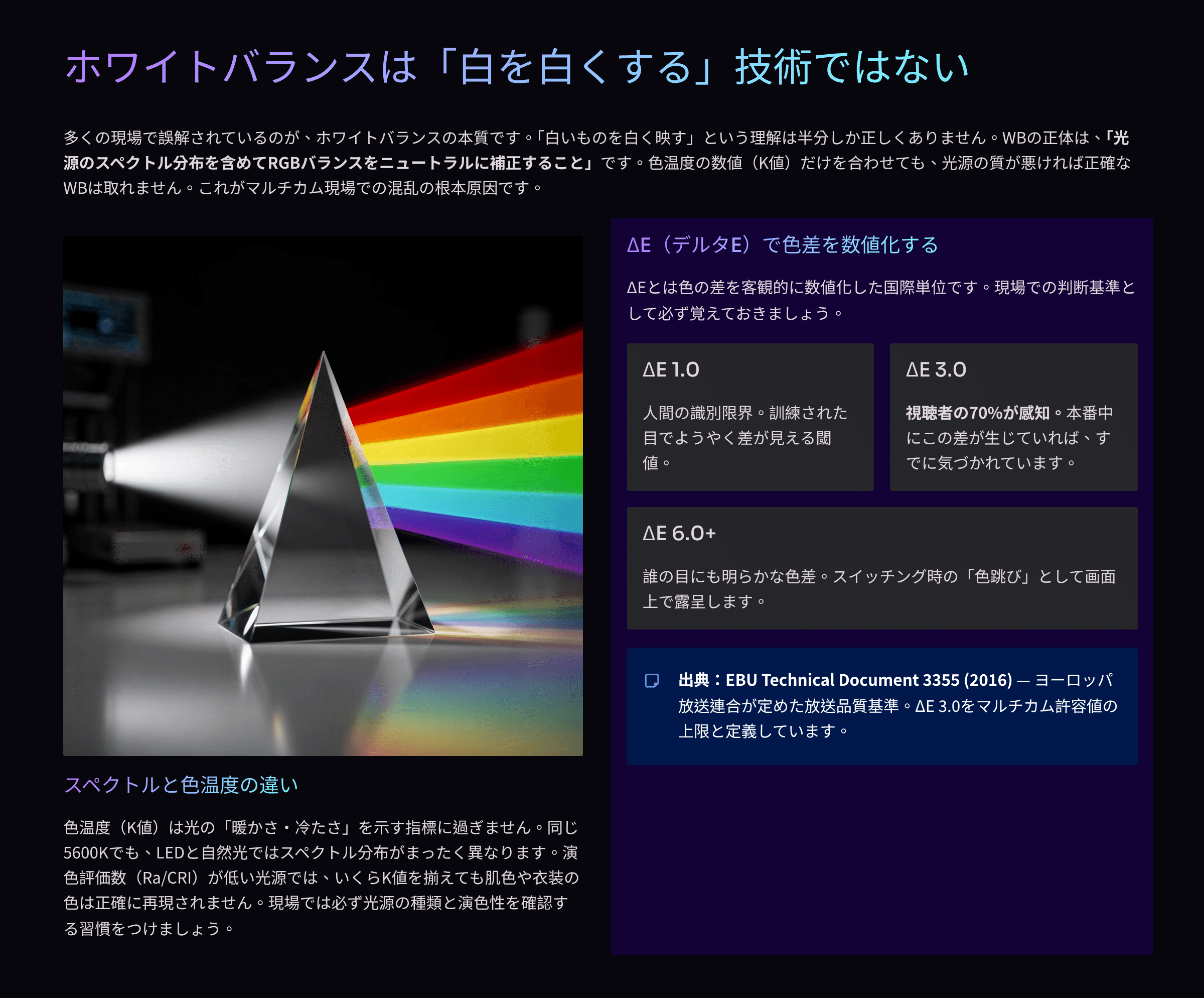 ホワイトバランス(以下、WB)を正確に取るとは、光源の色温度と、そのスペクトル分布(光の波長ごとの強さの分布)を含めて、映像のRGBバランスをニュートラルに補正することだ。色温度の数値だけ合わせても、光源の質が悪ければ正確なWBは取れない。これが、多くの現場で「合わせたはずなのに揃わない」が起きる本質的な理由だ。