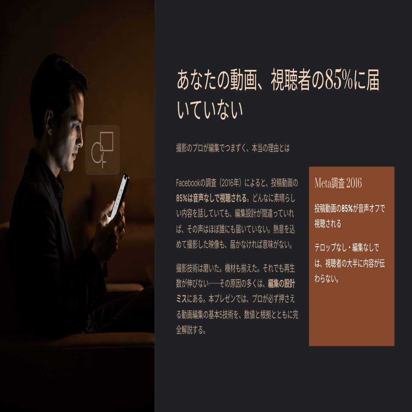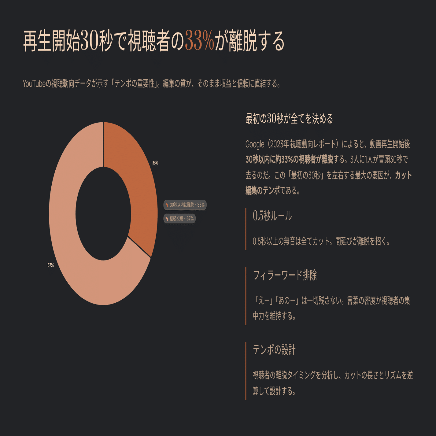 これが意味することは一つだ。どれだけ良い内容を話していても、テロップと映像の情報設計がなければ、視聴者の半分以上に届かない。