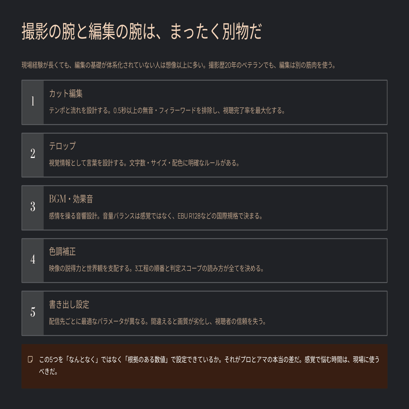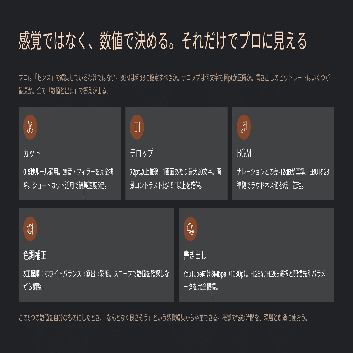 読み終えたとき、あなたは「なんとなく編集している」状態から、「根拠を持って設定を決められる」状態に移行しているはずだ。
