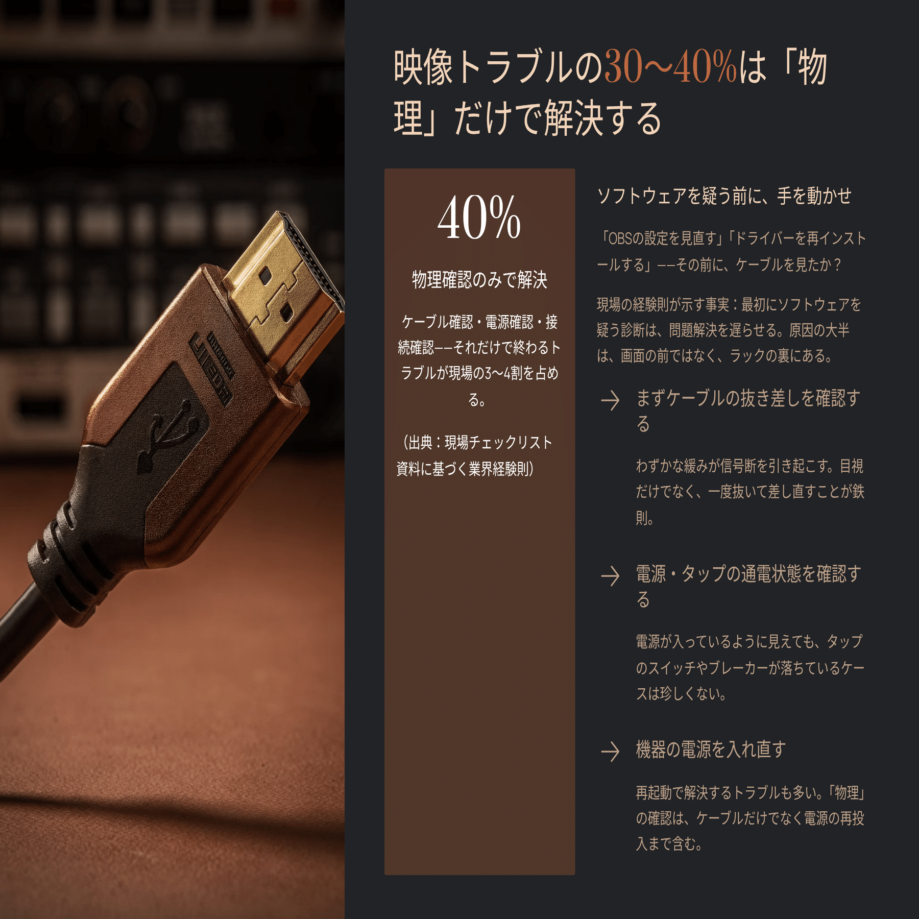この数字が意味することは単純だ。「画面が出ない」「映像が黒い」という状況に10回遭遇したとき、3〜4回は「ケーブルが正しく刺さっていなかった」「機材の電源が入っていなかった」という、ほぼ1分で確認できる物理的原因が正解だということだ。