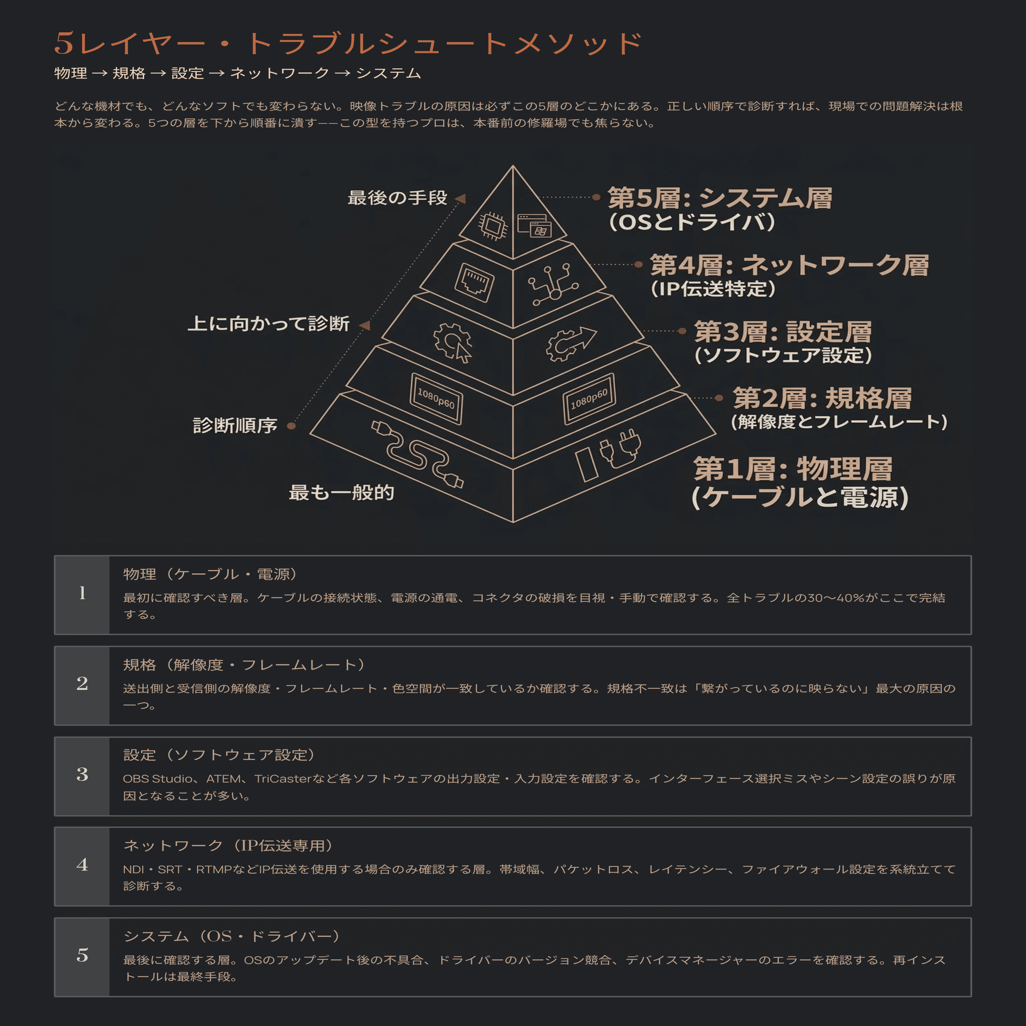 有料部分では、映像トラブルを5つの層(レイヤー)に分けて系統立てて診断するメソッドを完全公開する。各レイヤーについて、**状況(何が起きているか)→解釈(それが何を意味するか)→行動(具体的に何を確認するか)**の3軸で整理しているため、読んだ直後から現場で使える。