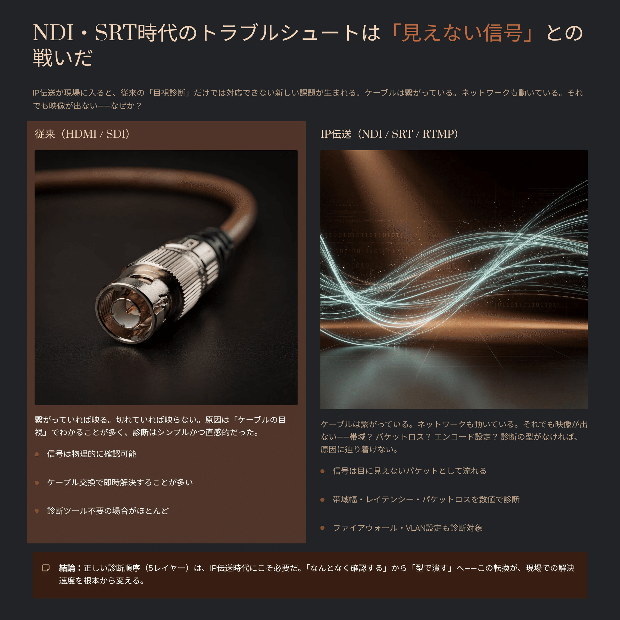 IP伝送の現場に立つプロが「どこから疑えばいいか」を即座に判断できるようになる。それが、この記事の約束だ。