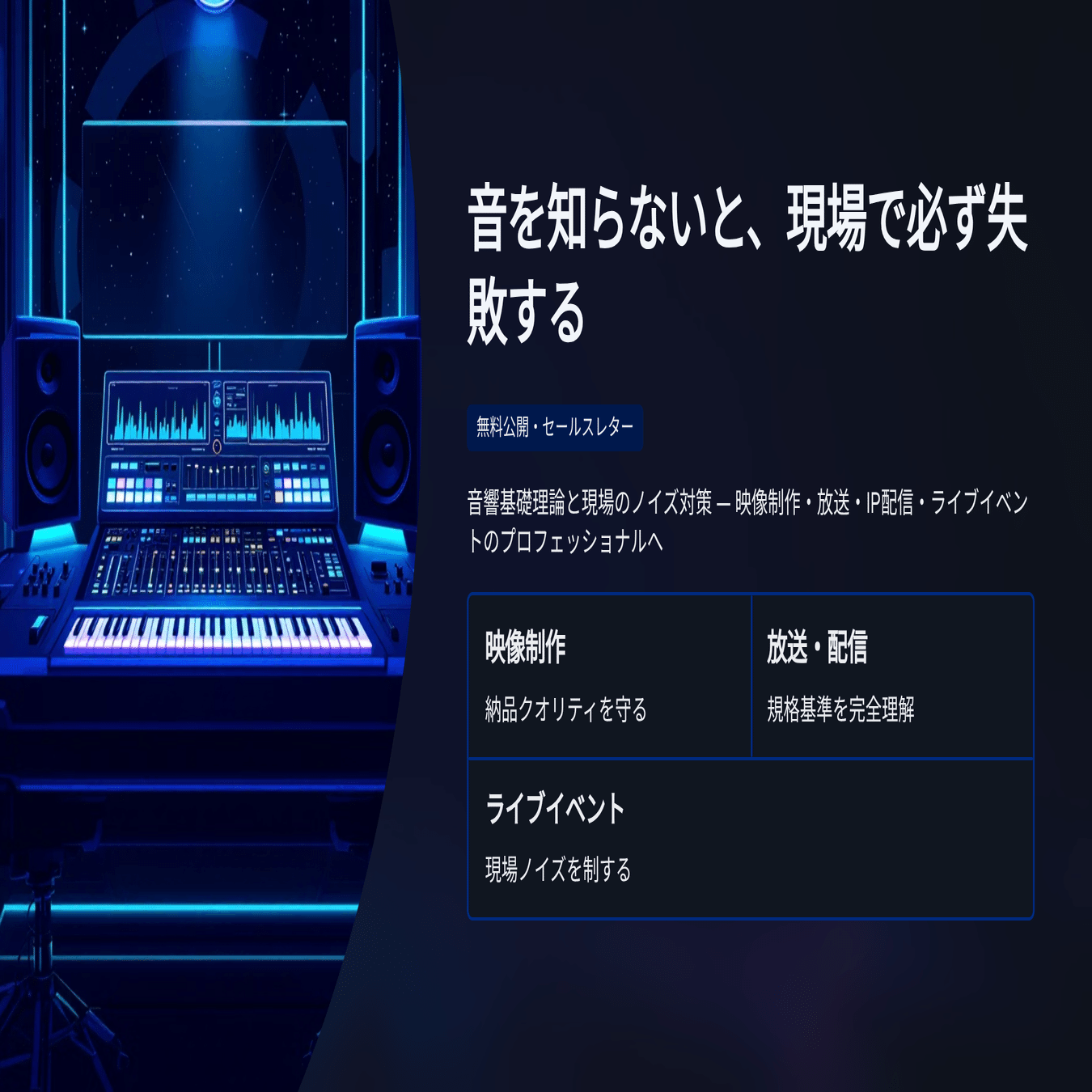 対象読者:大学の映画・映像学科や放送技術専門学校の「技術補習」を前提に、単なる再説明ではなく「現場で使える再構築」と「抜けている実務スキルの補完」が軸になります。映像制作・放送・IP配信・ライブイベントに携わるプロフェッショナル。 音はわかっているつもりだが、納品クレームやモノラル変換の失敗が後を絶たないあなたへ。
