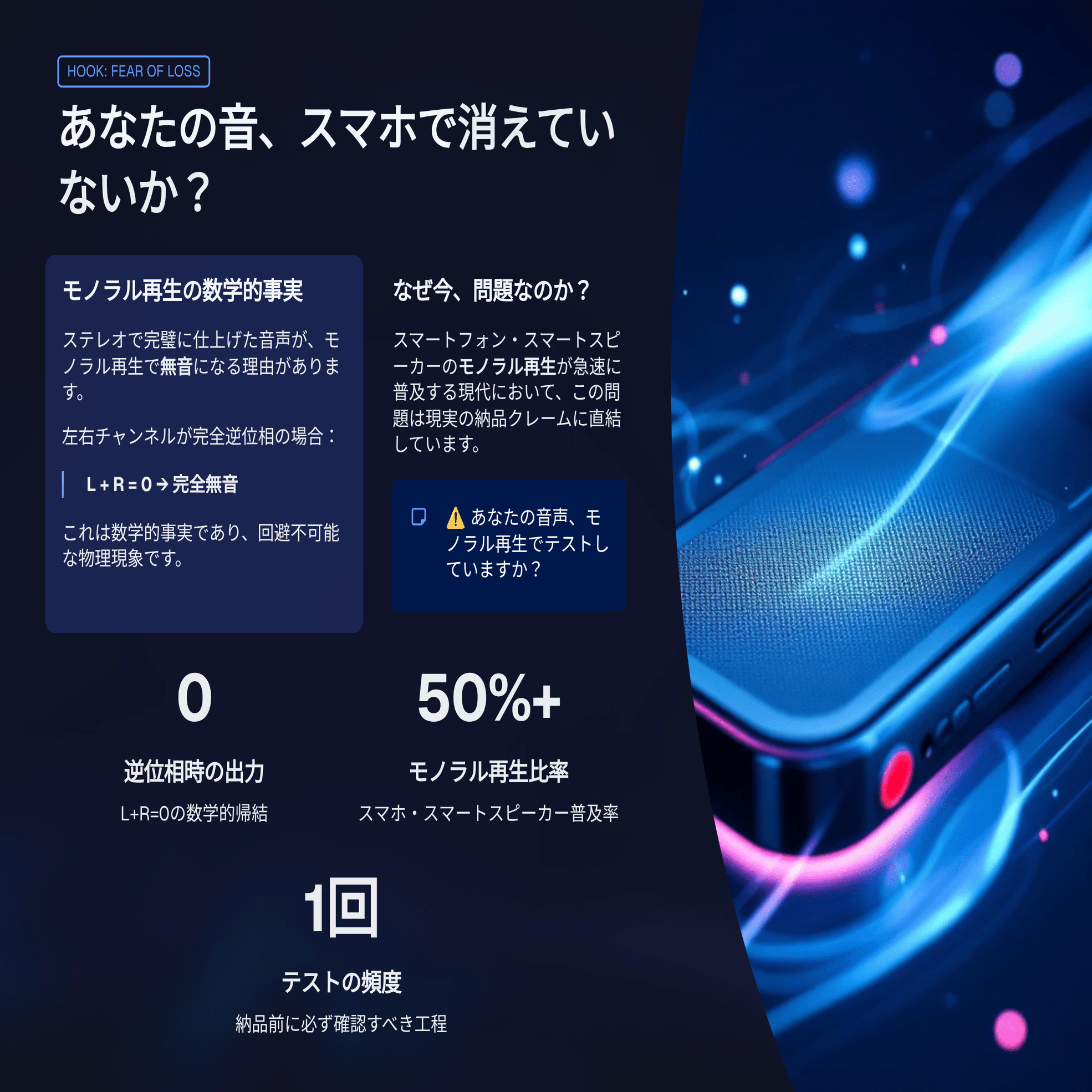 第2層:ステレオ信号内の位相問題 左右チャンネルの時間的なズレや逆位相成分は、ステレオ再生では気づきにくい。しかしモノラル再生環境(一部のスマートスピーカー、テレビの内蔵スピーカーなど)では、左右信号が合成されたとき特定周波数が打ち消し合い、最悪のケースでは無音になる。