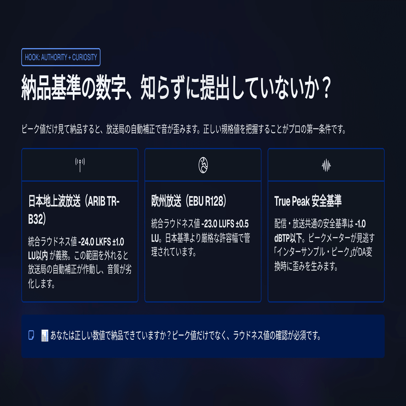 第1層:レベルと知覚の乖離(ラウドネス管理) デジタルメーターの数字は見ているが、それが「人間の耳が感じる音量」とズレているケースだ。日本の地上波放送規格(ARIB TR-B32)では統合ラウドネス値を-24.0 LKFS ±1.0 LU以内に収める義務がある(出典:ARIB TR-B32, 2011年策定)。これを知らずに波形のピークだけを見て納品すると、放送局側の自動補正で音が歪む。