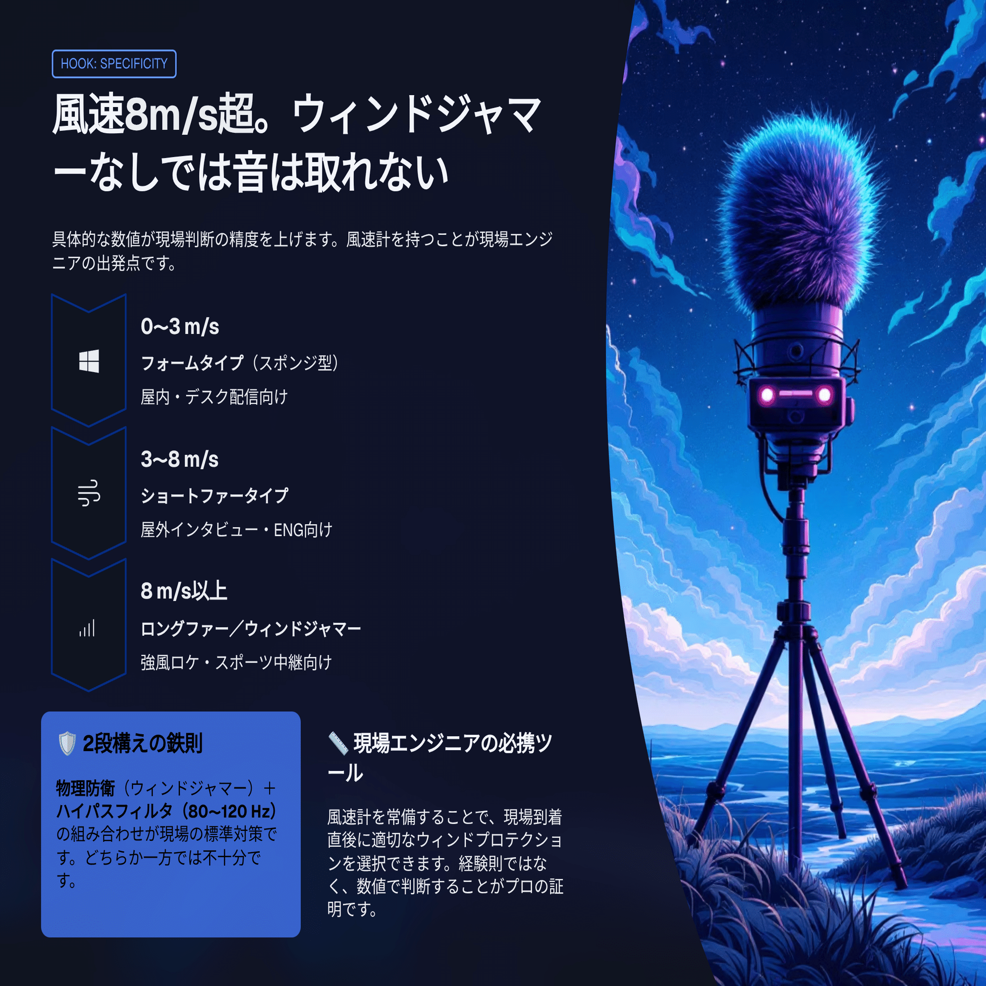 - 風速ごとに選ぶべきウィンドスクリーンの種類と、ハイパスフィルタとの組み合わせ方