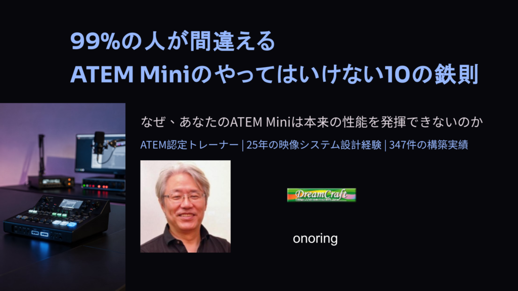 なぜ、あなたのATEM Miniは本来の性能を発揮できないのか ATEM Miniを導入したものの、配信中に映像が途切れる、音声にノイズが乗る、録画ファイルが破損している——こうしたトラブルに見舞われた経験はないだろうか。 私はATEM認定トレーナーとして、過去5... -