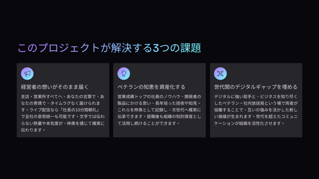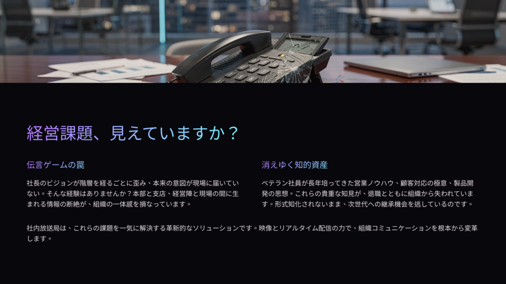支店・営業所すべてへ、あなたの言葉で、あなたの表情で、タイムラグなく届けられます。ライブ配信なら「社長の10分間朝礼」で全社の意思統一も可能です。