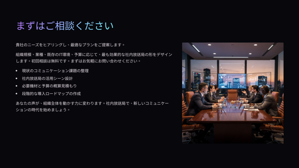 - 既存の会議室やスマートフォンを活用した最小規模スタートが可能